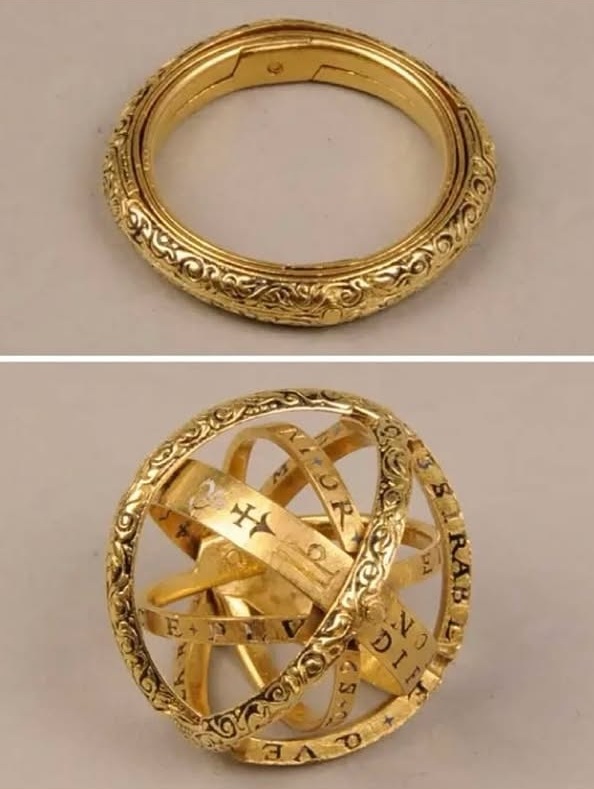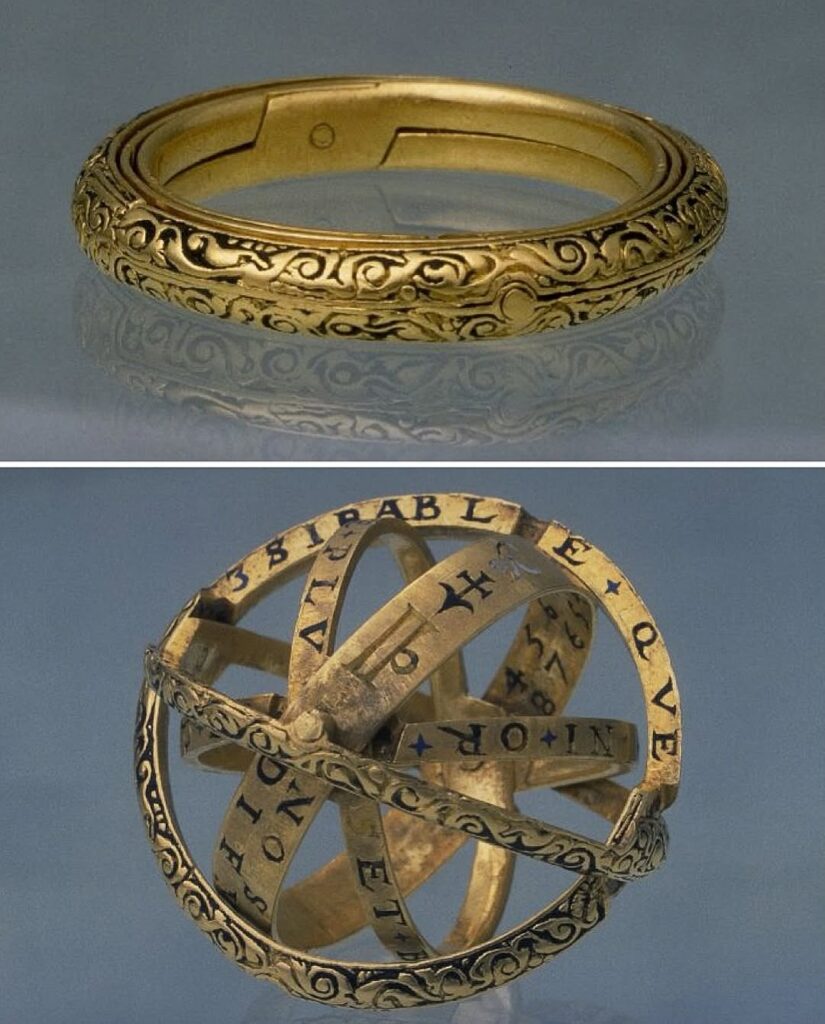 In the 16th century, during the height of the European Renaissance, German goldsmiths created one of the most extraordinary pieces of jewelry ever crafted — an engagement ring that opened up into a fully functional miniature astronomical sphere. At first glance, it appeared to be an ordinary gold band. But with careful unfolding, the ring expanded into several interlocking hoops, forming a tiny armillary sphere that represented the structure of the cosmos as understood at the time.