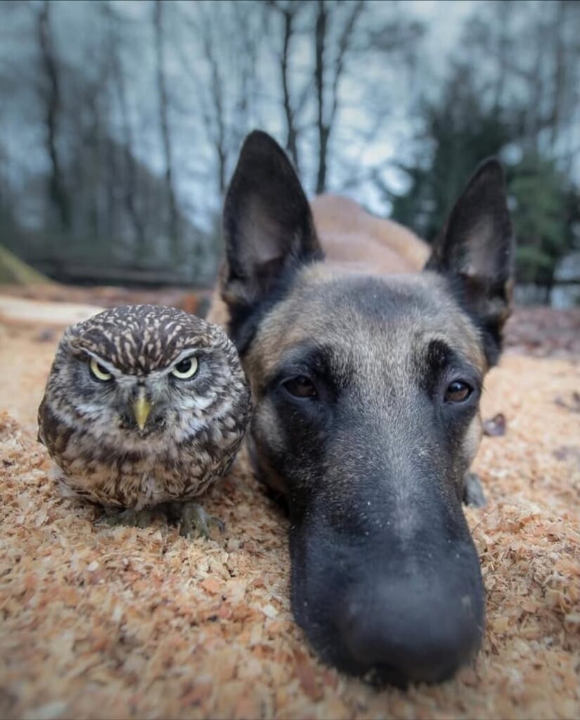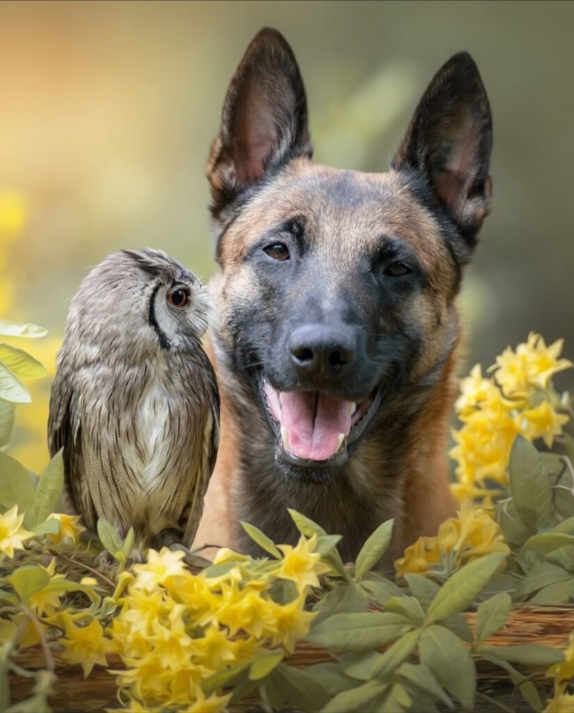 Some friendships don’t need words — they’re built on presence, trust, and quiet understanding. One such bond exists between Ingo, a large German Shepherd, and Poldi, a young little owl, who live together in Germany under the care of wildlife photographer Tanja Brandt.