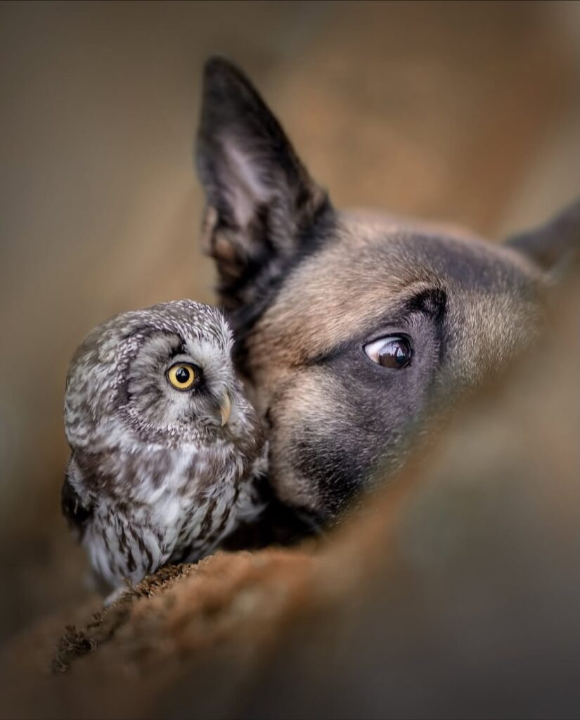 At first glance, the pairing seems unlikely. A powerful dog and a fragile owl belong to very different worlds. Yet, through Brandt’s lens, their relationship reveals something rare and deeply moving: companionship without fear.
