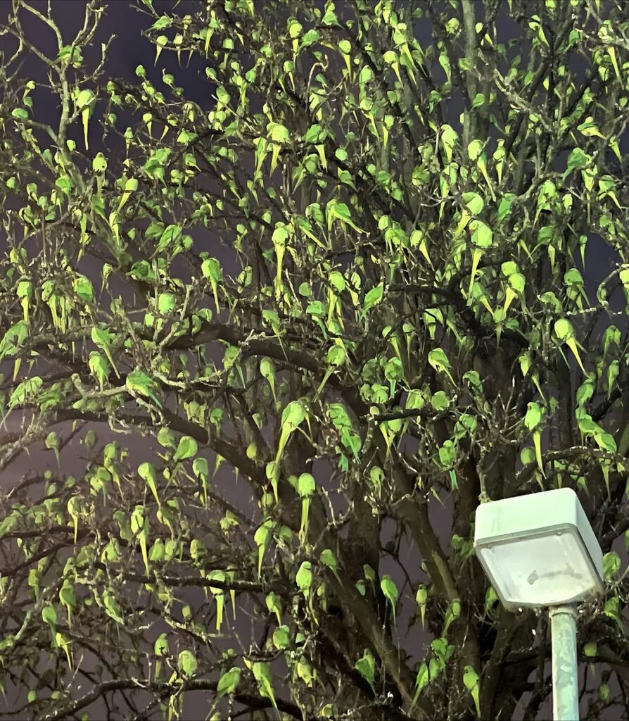 Today, their population numbers in the tens of thousands, thriving across London’s parks and suburbs. As evening falls, they gather in massive flocks that fill the sky with noise before settling onto trees, turning the branches into living, fluttering tapestries of green.
