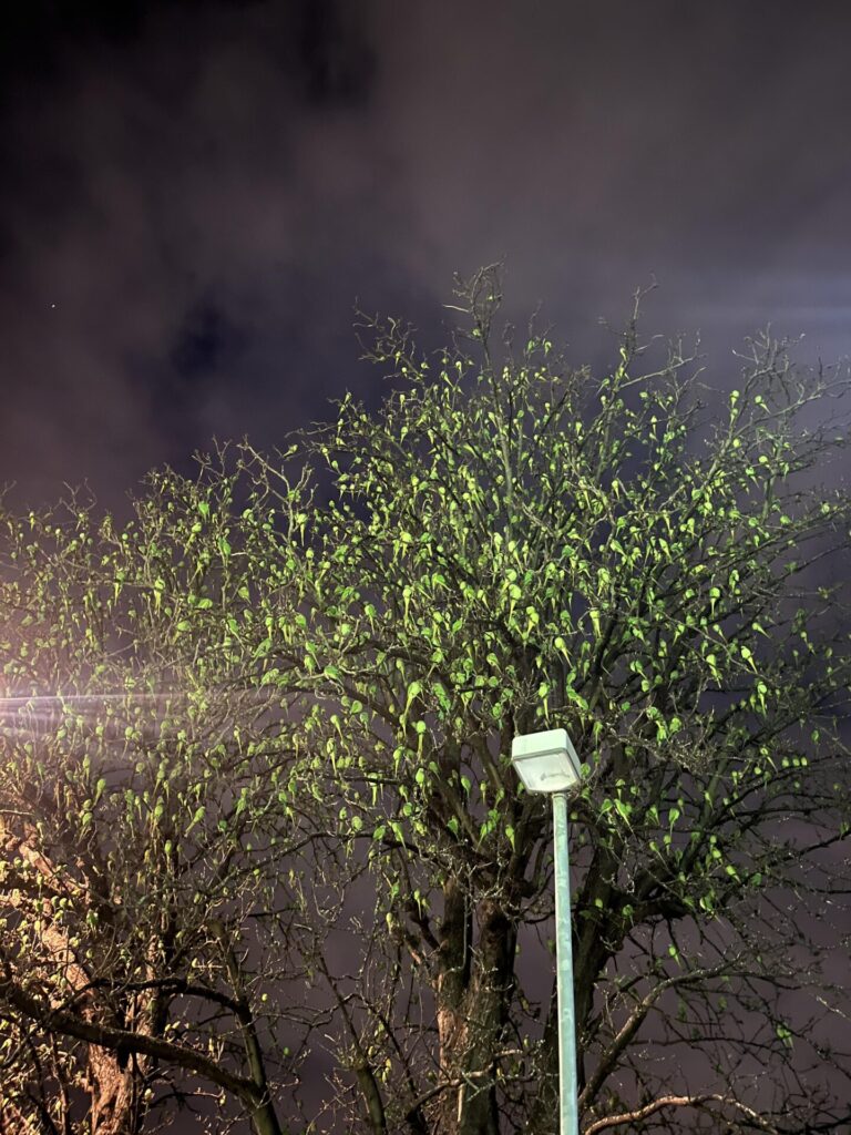 For a moment, it looks as if the trees themselves have come alive — glowing softly beneath the city lights, whispering the wild echo of faraway rainforests.