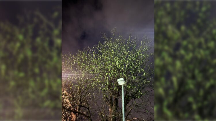 For a moment, it looks as if the trees themselves have come alive — glowing softly beneath the city lights, whispering the wild echo of faraway rainforests.