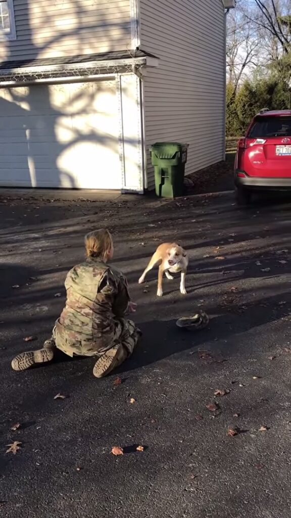 When Berger finally returned home, she arrived in uniform while her family recorded the moment. As Murphy came outside, Berger expected an immediate reaction — but instead, the dog hesitated.