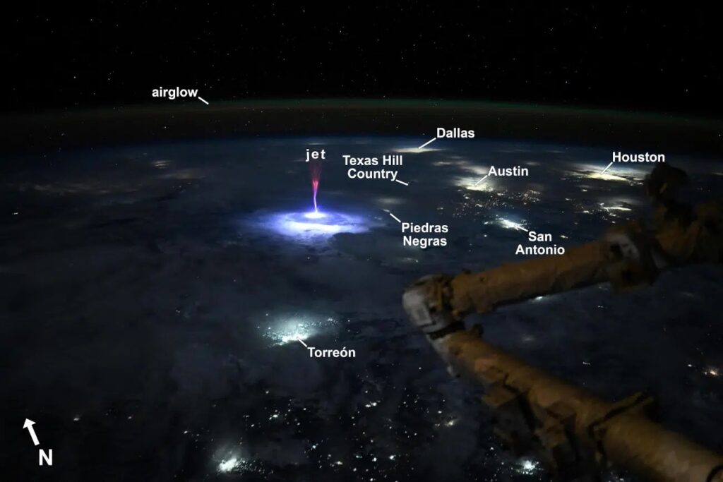 Ayers spotted and photographed the phenomenon as the ISS passed over the U.S.–Mexico border on July 3. Using a Nikon Z9 with a 50mm lens (f/1.2, ¼ sec, ISO 6400), she documented the jet striking upward from the storm.