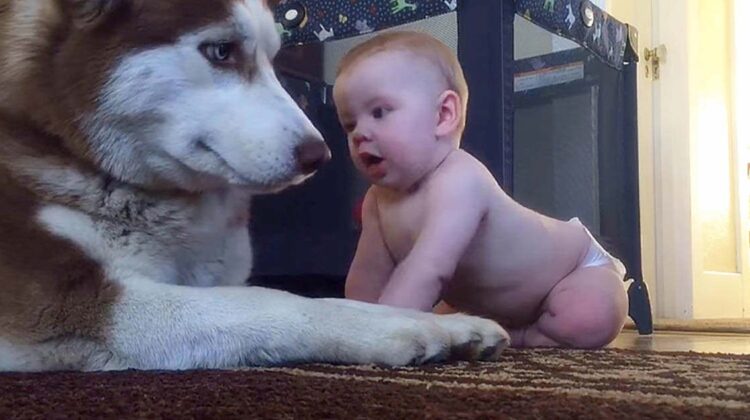 In a heartwarming video that has captured the attention of animal lovers and parents alike, a baby slowly crawls across the floor toward a large husky resting nearby. Curious and fearless, the baby reaches out as if to say hello.