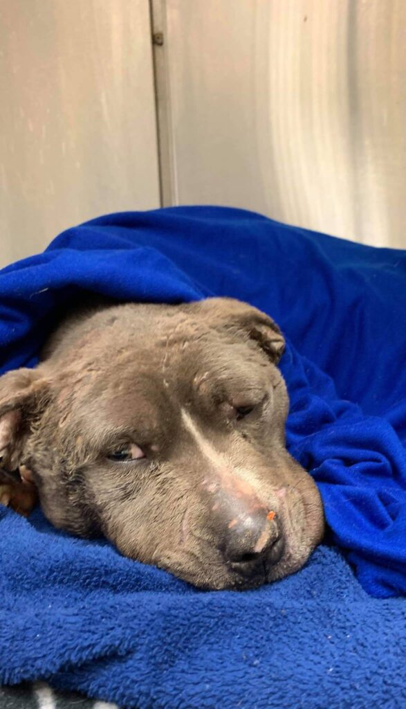 An emaciated three-year-old female dog was discovered abandoned inside a container outside an animal shelter, her body bearing unmistakable signs of prolonged abuse. She was severely underweight, covered in both fresh and healed wounds, and suffering from a dramatically swollen head. The injuries made one grim reality clear: this gentle dog had been used as a bait dog in illegal dog fighting.