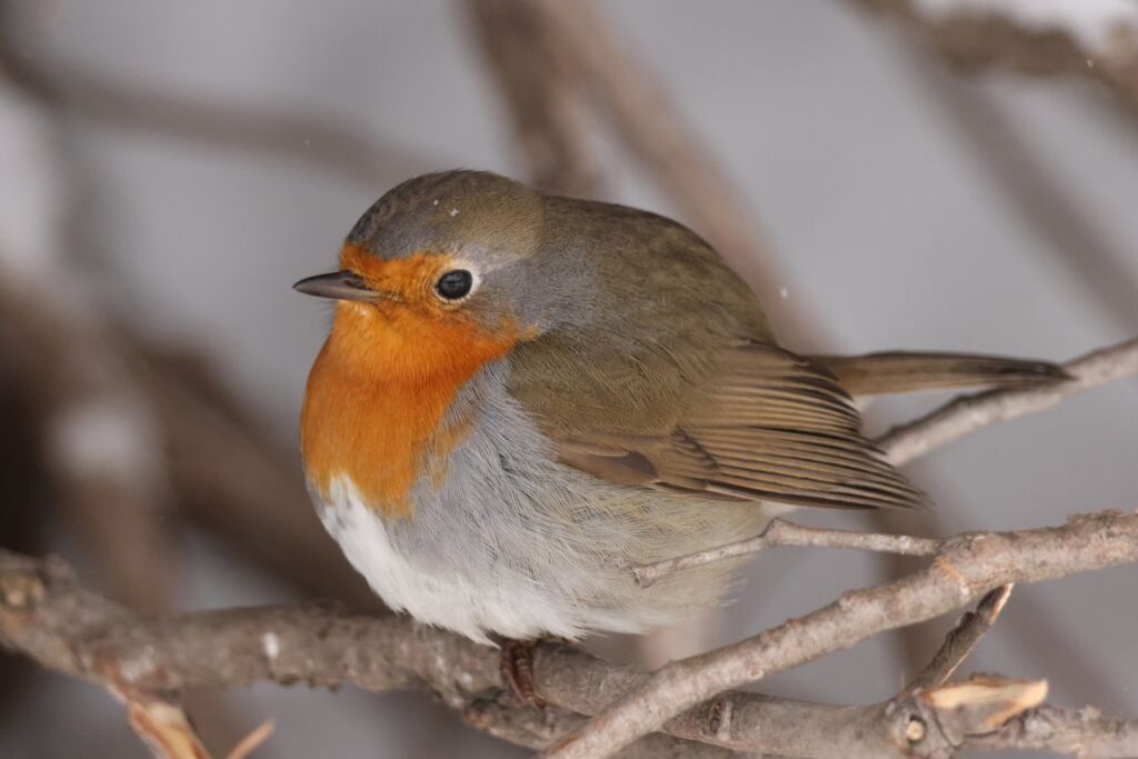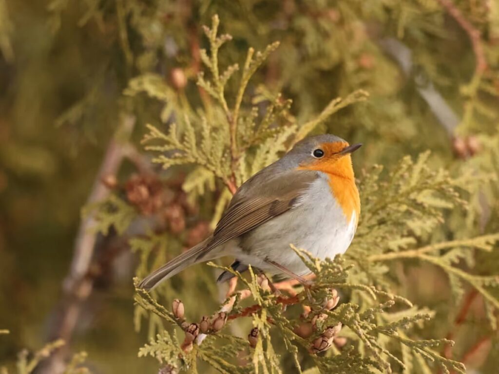 The European robin is easily recognized by its bright orange face and chest. It is commonly found across Europe, parts of western Asia, and North Africa. Despite its name, it is not closely related to the American robin.