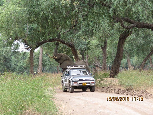 What they didn’t expect was an elephant calmly walking straight toward their truck.