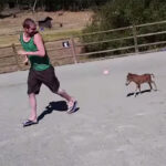 In this adorable video, a little horse is having the fun of its life following a gigantic person
