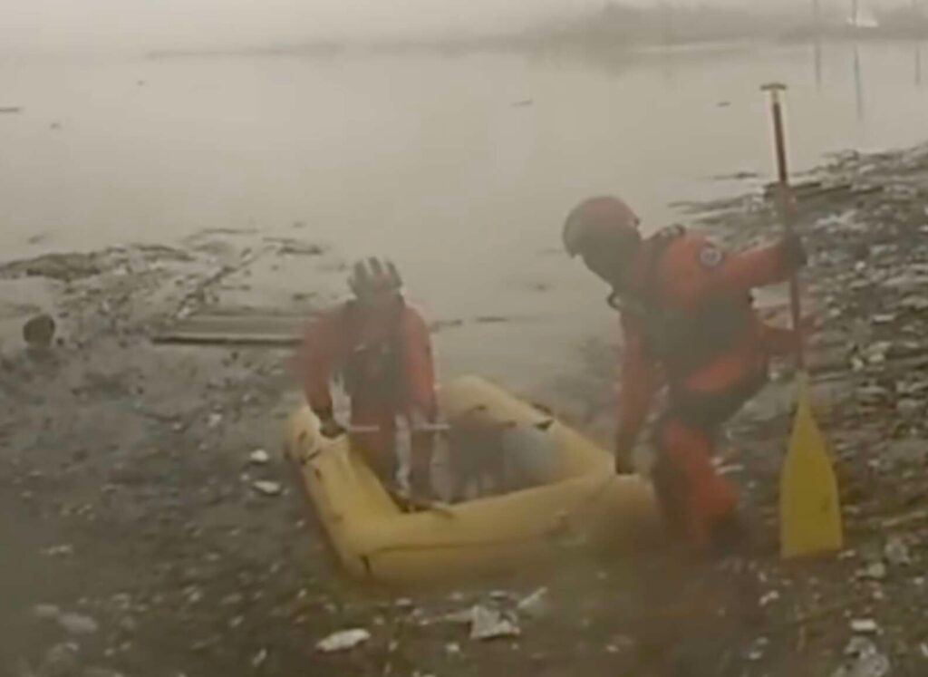 Using a boat, rescuers carefully made their way across the water until they were close enough to reach the struggling creature.