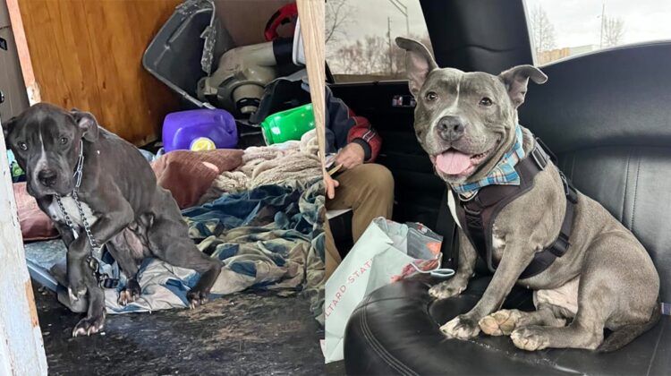Chester, a 4-year-old pit bull, was rescued along with three other dogs from an abusive, neglectful home situation in August 2022. He was found chained up in a vacant house, nearly starved to death.