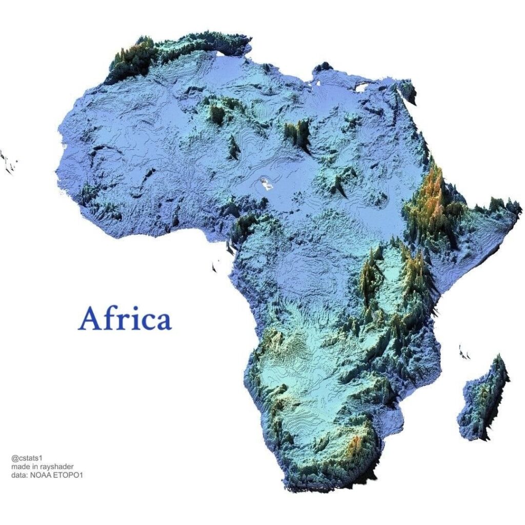These elevation maps display the height of Earth’s continents in a single, clear visual, revealing how the planet’s surface rises and falls across enormous regions. From Asia’s towering mountain systems to Africa’s vast low-lying landscapes, differences in elevation become instantly visible.