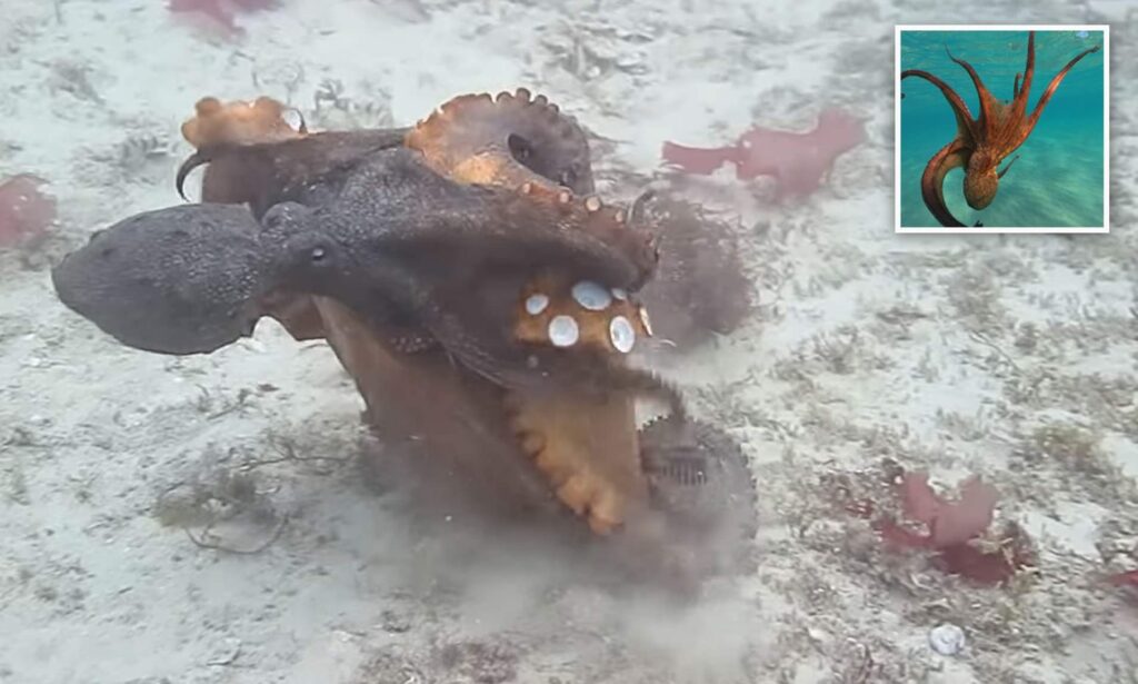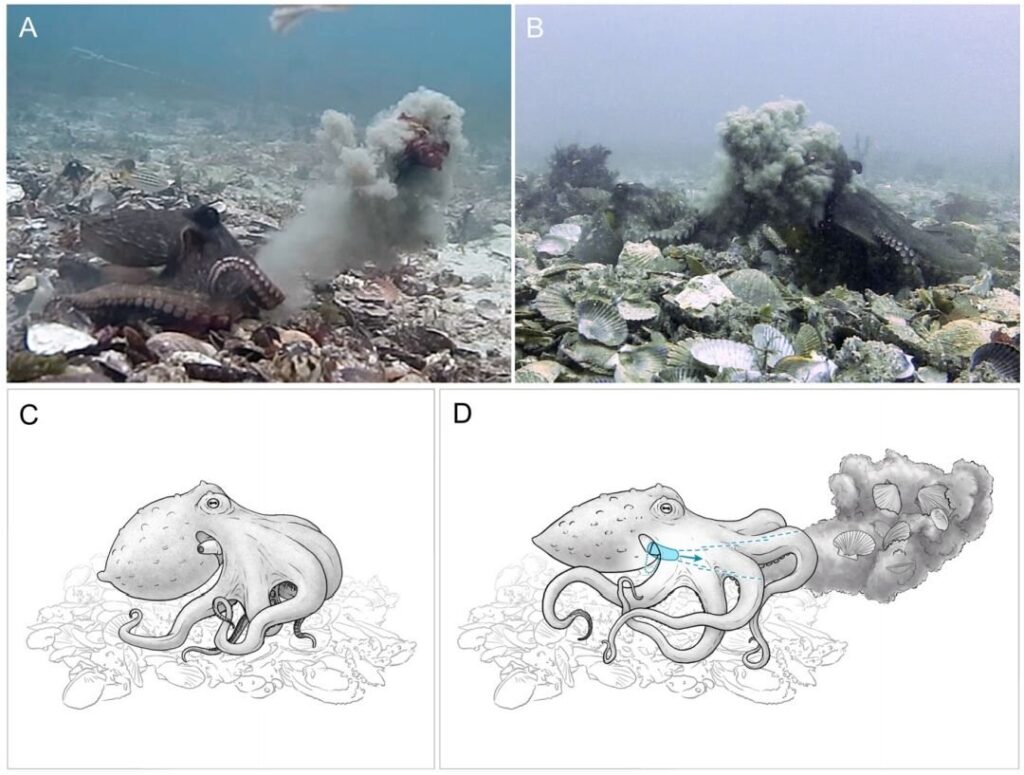 Researchers studying octopuses off the coast of Jervis Bay recorded multiple instances of individuals gathering materials such as shells and silt before propelling them through the water using a jet from their siphon.