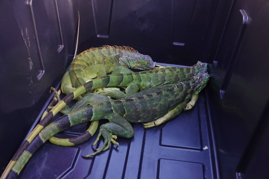 He wasn’t alone. Throughout Sunday, hundreds of residents arrived at drop-off locations carrying iguanas in trash bags, plastic bins, garbage cans, and storage tubs.