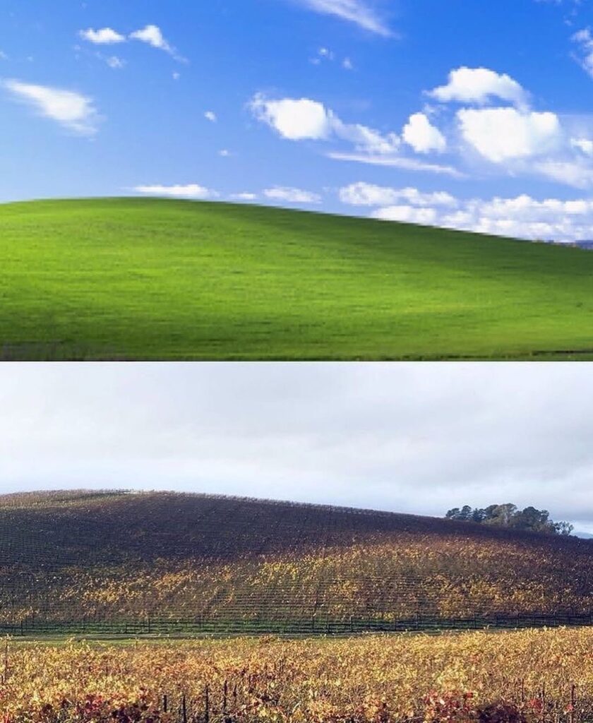 The original “Bliss” photo was taken by Charles “Chuck” O’Rear near the Napa-Sonoma County line. While driving, he noticed a field among vineyards that had been cleared the previous year due to an infestation by phylloxera, an insect that devastates grapevines.