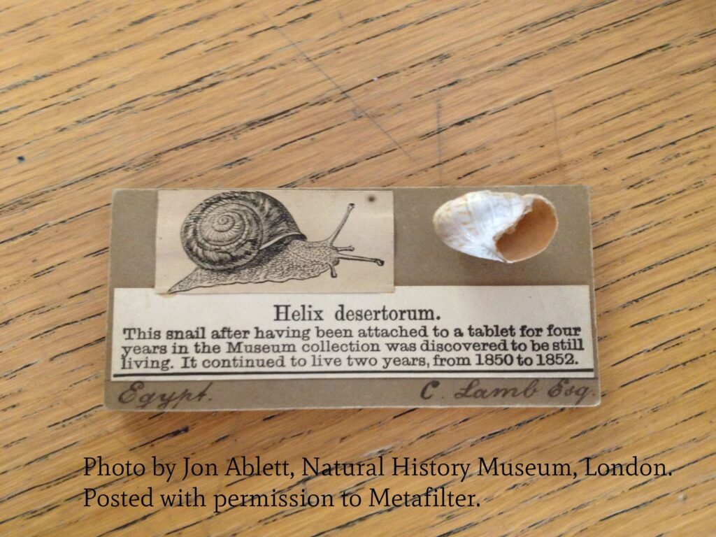 This bizarre story begins in the mid-1800s when researchers were collecting wildlife specimens in the Egyptian desert. Among these samples was a small desert snail. As was customary in archiving biological specimens at the time, this snail was glued to a “specimen card” to be displayed at the British Museum in London, under the assumption that it was merely an empty shell or a dead creature.