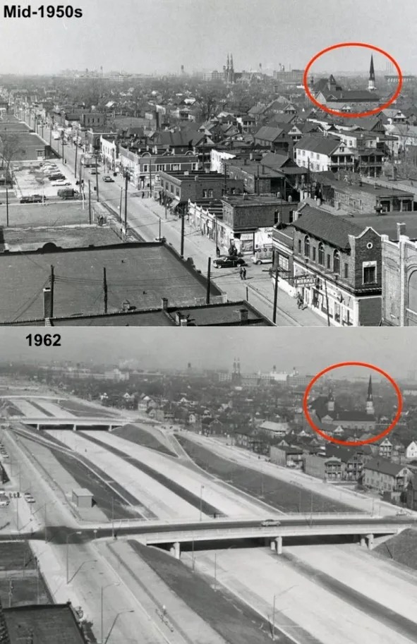 Shared on r/UrbanHell, a subreddit dedicated to highlighting urban design failures, the post compares two images of the same Detroit neighborhood — one from the mid-1950s and another from 1962.