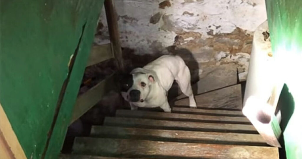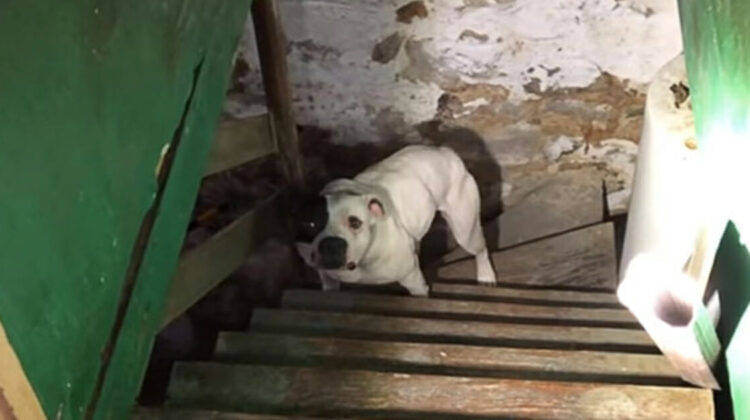 After receiving a panicked call from a man claiming to have found a pitbull chained up in his basement, rescue workers arrived and shined a torch down into the darkness. The dog’s reaction is something to behold …
