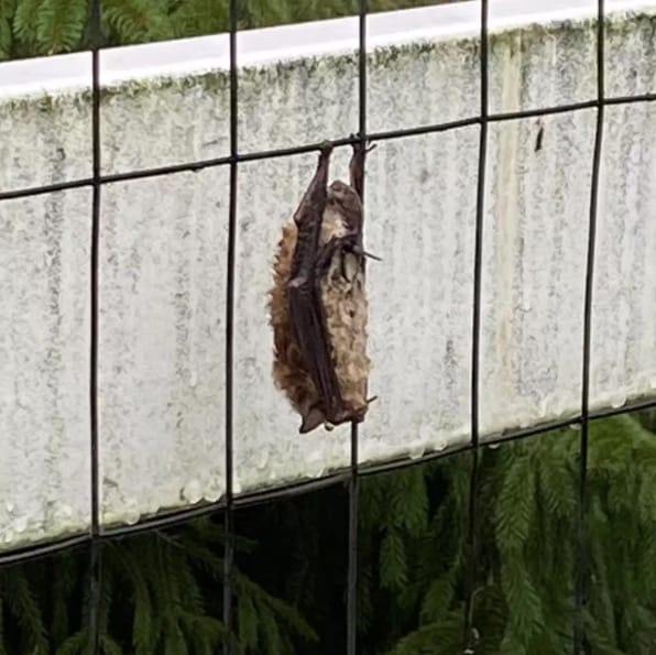 An elderly brown bat, now named Bea Arthur, was found clutching a metal fence in Gilbertsville, Pennsylvania — soaking wet and completely exposed after a storm.
