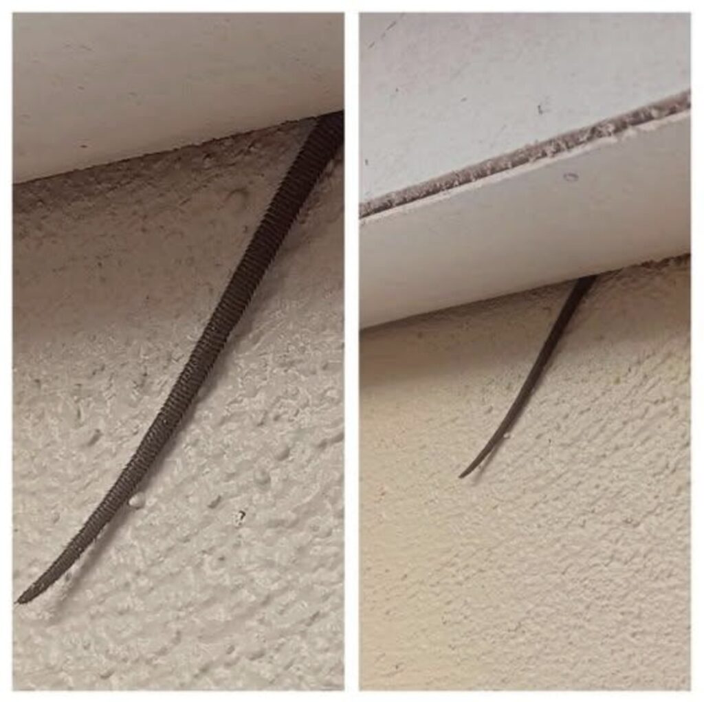Rats and mice often live inside walls, ceilings, crawlspaces, and attic insulation — unnoticed until they leave signs behind. Sometimes, that sign is as subtle (and horrifying) as a tail slipping through a ceiling panel.