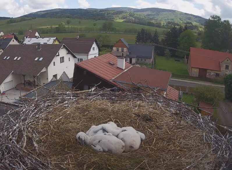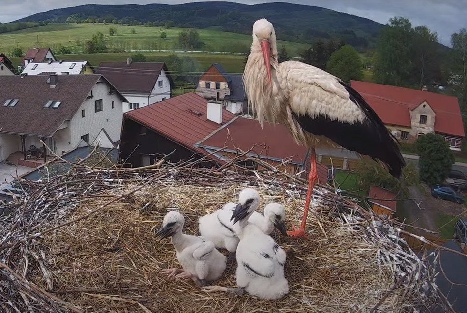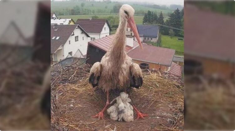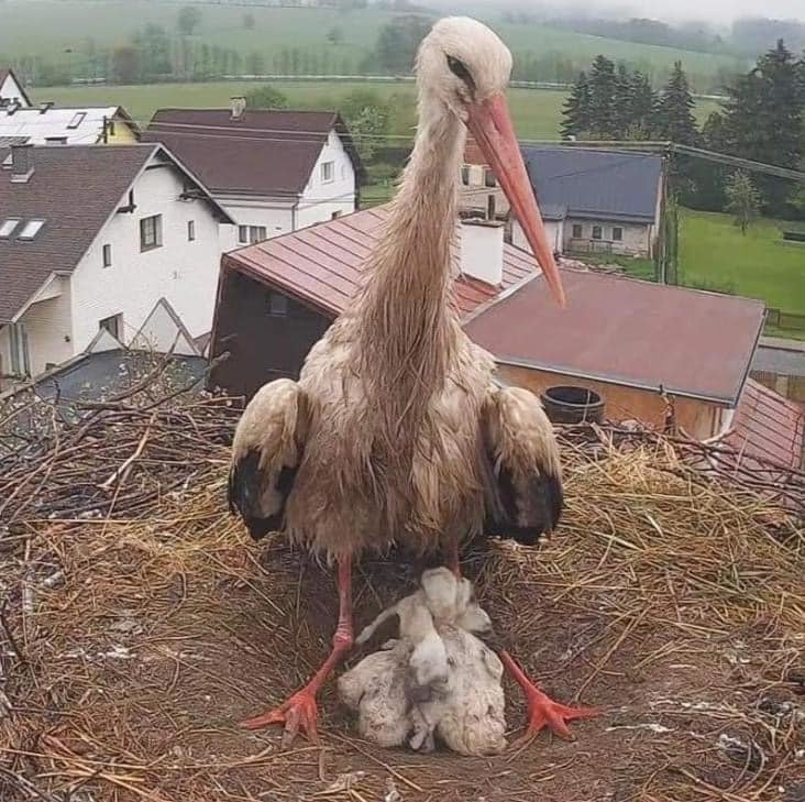 Soaked, disheveled, and heartbreakingly alone, a stork sits silently in his nest high above the Czech village of Olbramovice. Between his feet, three fragile chicks huddle close, unaware of the tragedy that’s befallen their small family. Their mother is gone — killed instantly after striking high-voltage power lines — and now, the weight of survival falls entirely on one father’s wings.