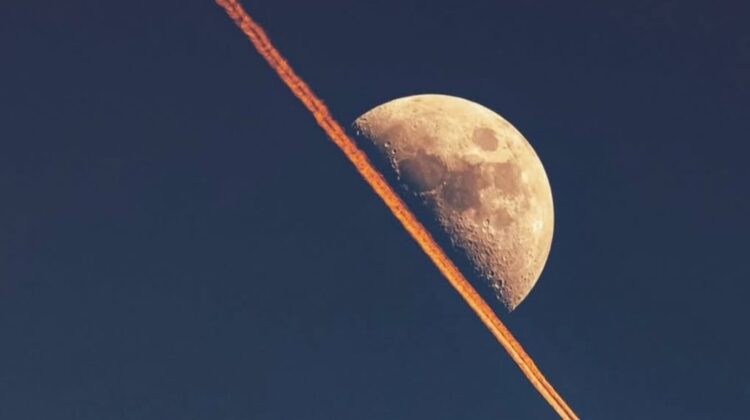 A breathtaking image has stunned sky-watchers after a photographer captured the exact moment a jet’s contrail appeared to slice straight through the moon. The glowing streak, illuminated by the setting sun, lined up so perfectly with the lunar surface that it looked as if the moon itself had been cut in half.