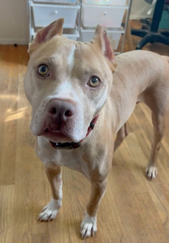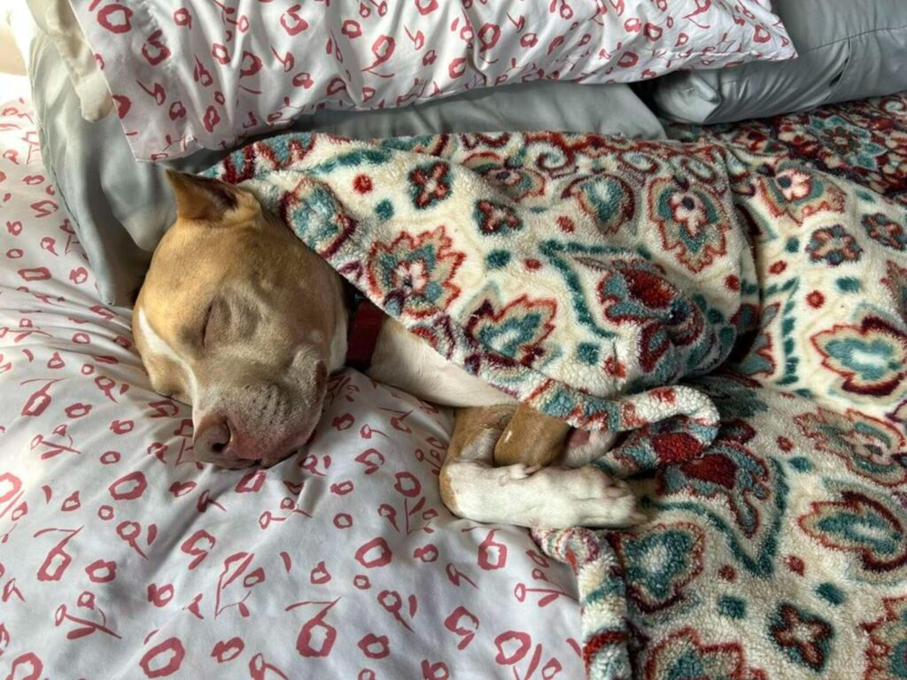 His days are filled with comfort, toys, cozy blankets, and the companionship of both humans and other rescue dogs.