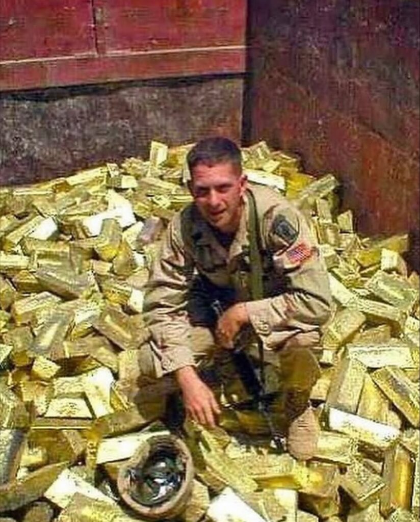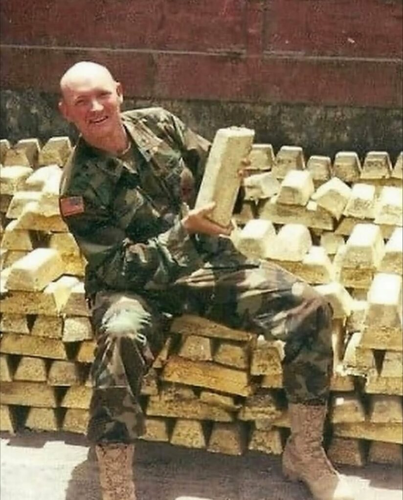 A rare photograph taken in 2003 shows a U.S. soldier from the 173rd Airborne Brigade standing beside stacks of gold bars recovered during the early stages of the Iraq War — a moment that quietly reflects the economic and political collapse unfolding at the time.