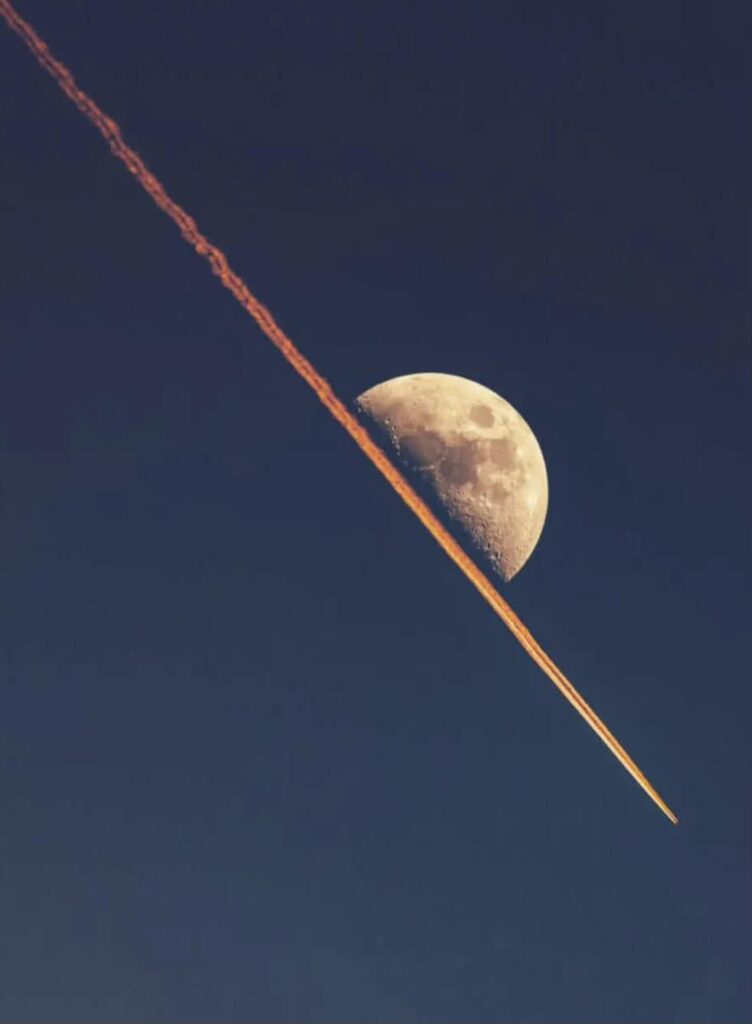 In reality, the plane was flying at a typical cruising altitude, far closer to Earth than the moon. The illusion occurs when the aircraft passes precisely between the camera and the moon, with the condensation trail reflecting sunlight at just the right angle.