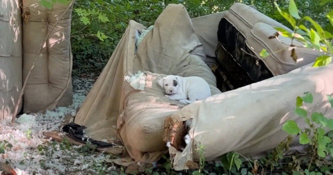 One puppy was curled on a torn sofa. Another huddled near a fence. Two more hid deep in weeds — leveraging natural camouflage behavior common in outdoor-born litters.