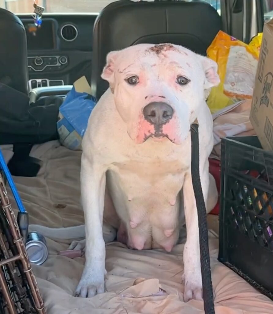 The white-furred mother — later named Donutfest — bore scratches on her head, her body thin from malnutrition. Her eyes reflected exhaustion, yet she stood guard over her puppies.