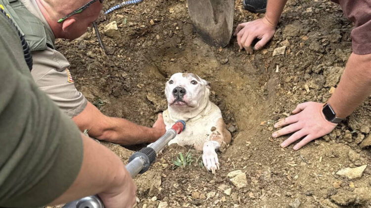 After about 90 minutes, rescuers carefully widened the hole and lifted Bruiser out. He was shaken, dirty, and embarrassed — but completely unharmed.