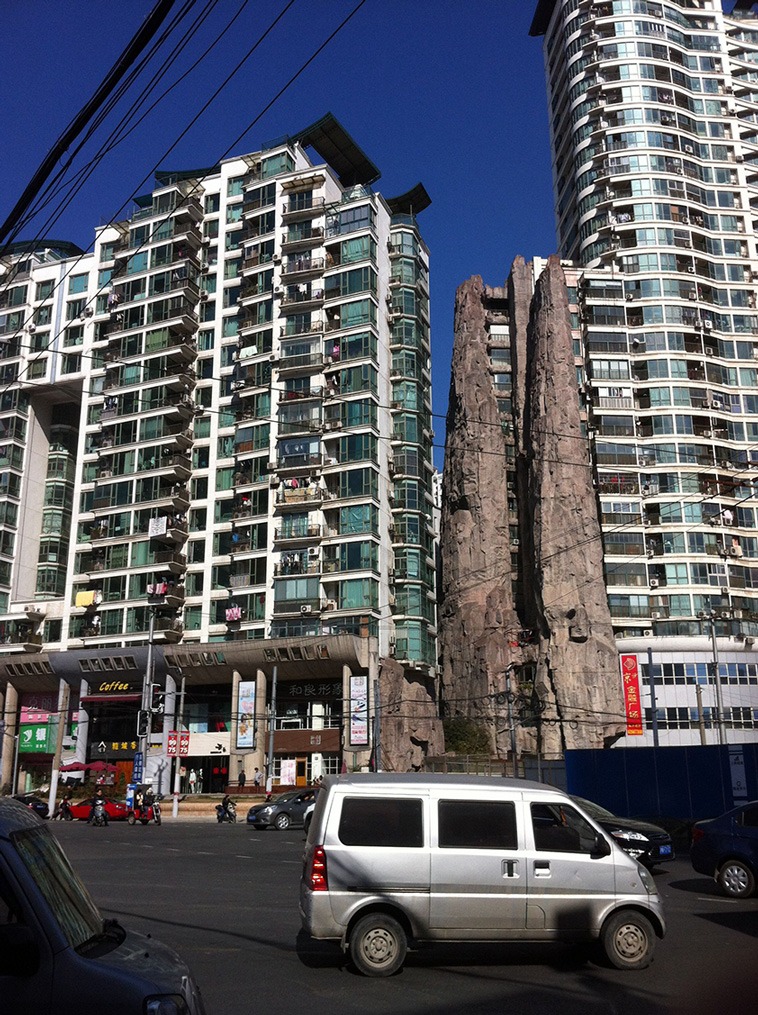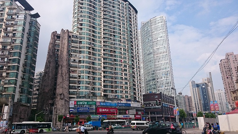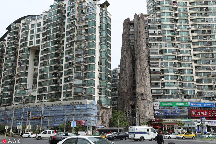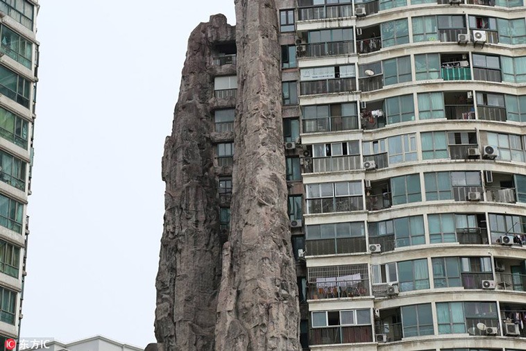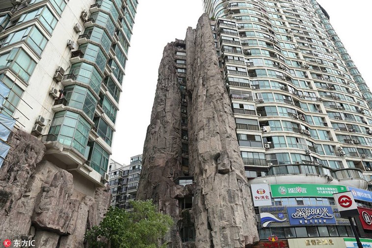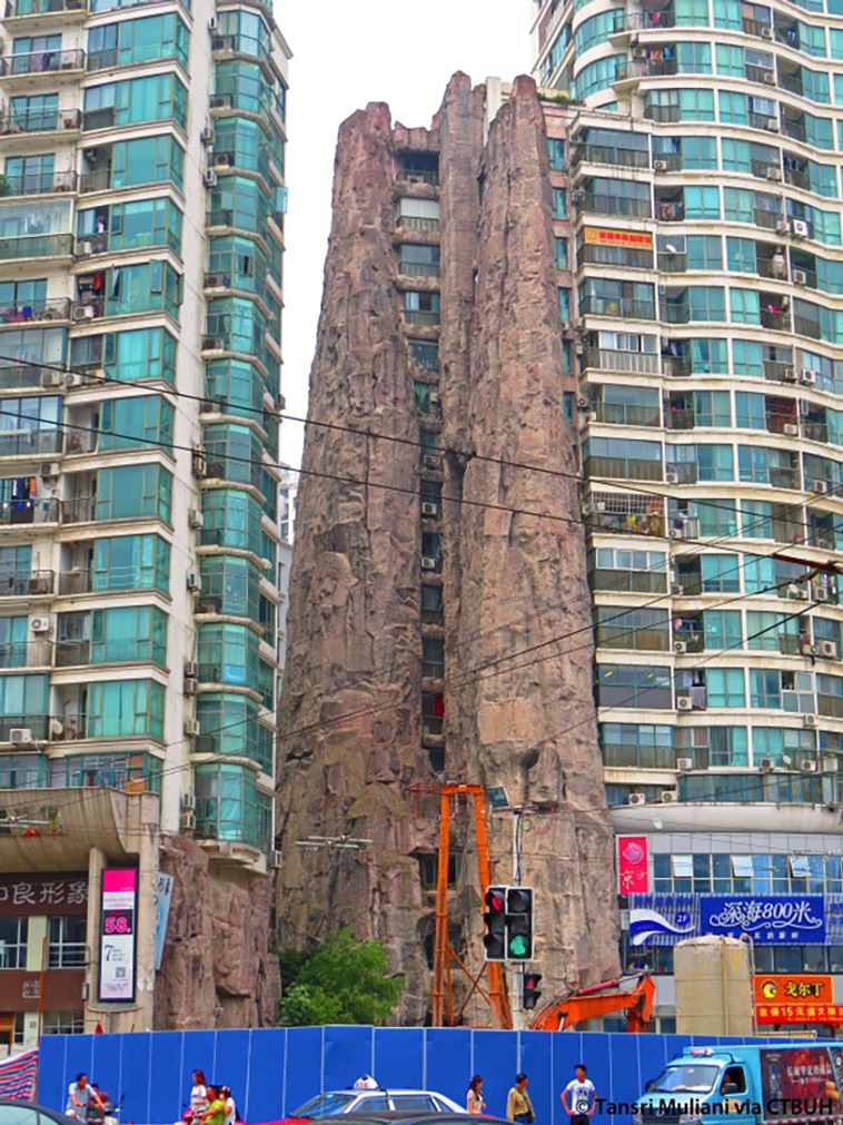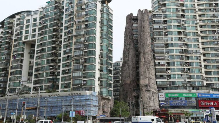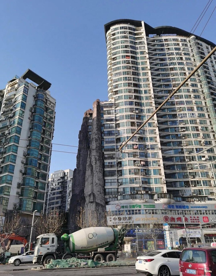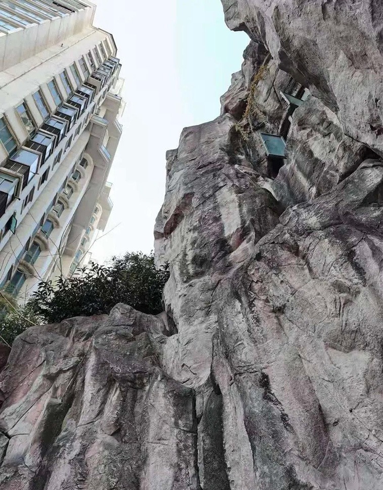 This building complex at 1258 Changde Road, Shanghai, China is wrapped by a 50-meter-high mountain. The design of the Shanghai Rock Building (also known as Shang Qing Jia Yuan) was based on Feng Shui, a Chinese philosophical system of harmonizing people with their surrounding environment. Those looking out the window will have a view of a 50-meter-high mountain. The artificial mountain was completed in 2003. The design aimed to “moderate the ferocious location of the building”.