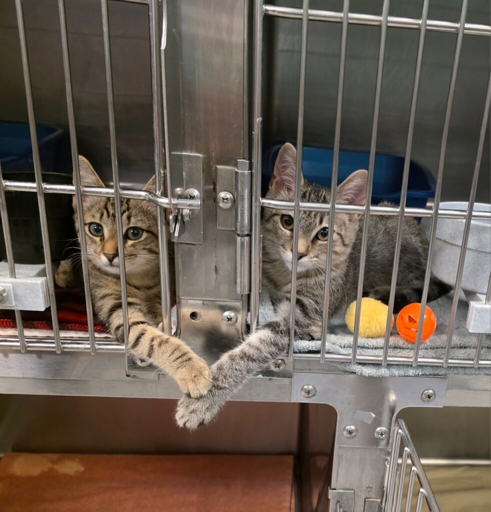 And then there was Pedro Pascal — another young kitten housed nearby. They weren’t littermates. They didn’t share a history. Yet somewhere between mealtimes and play sessions, they formed a quiet bond. Through the cool metal bars of their kennels, they reached for each other. Tiny paws extended, pads touching gently, as if instinctively understanding that comfort doesn’t always require space — only connection.