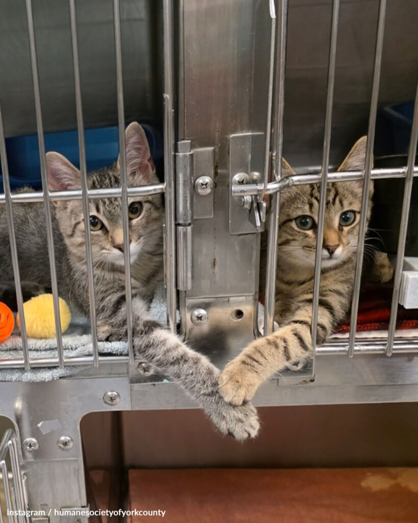 In a quiet corner of South Carolina, inside the cat room at the Humane Society of York County, a small moment unfolded that no one expected to become unforgettable. It wasn’t loud or dramatic. It didn’t demand attention. But when a shelter employee stepped inside and noticed two tiny paws reaching through separate kennel bars, gently touching, it stopped her in her tracks.