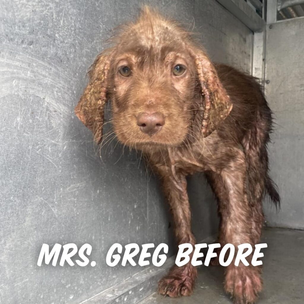 Two of the worst diagnoses a shelter dog can get — both contagious, painful, and often fatal. Most dogs don’t survive parvo. But somehow, Mrs. Greg did.