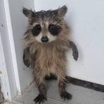 Lonely baby raccoon waits on porch after storm