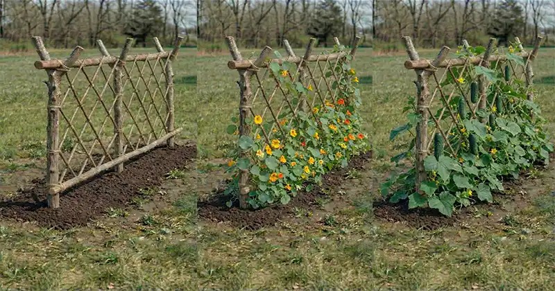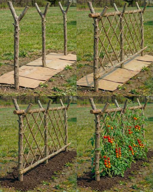 Anchor 3–4 thick branches into the soil as posts. Weave thinner branches diagonally, creating a diamond lattice, and secure with twine. The result is a flexible, nail-free trellis that can withstand wind, support vigorous climbers, and provide shelter for beneficial insects such as bees and butterflies.