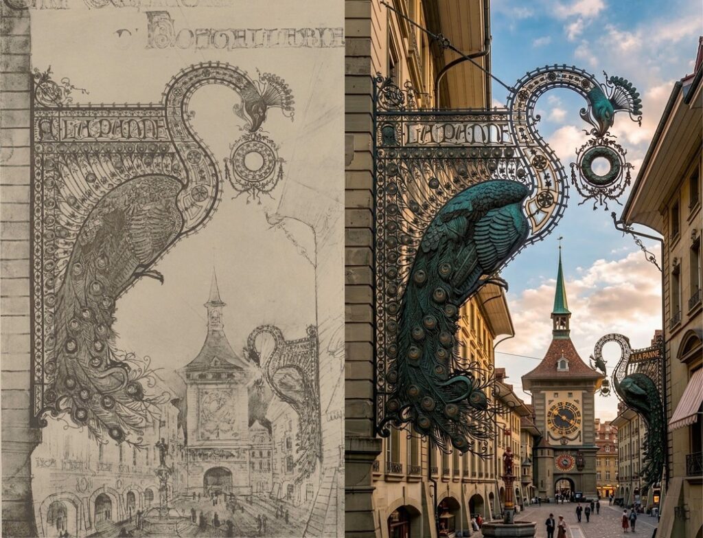Made from carefully shaped metalwork, every detail reflected hours of skilled labor. It stood in sharp contrast to the mass-produced signs that were beginning to dominate the streets.