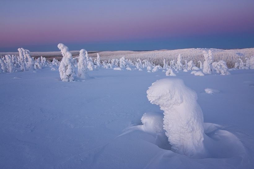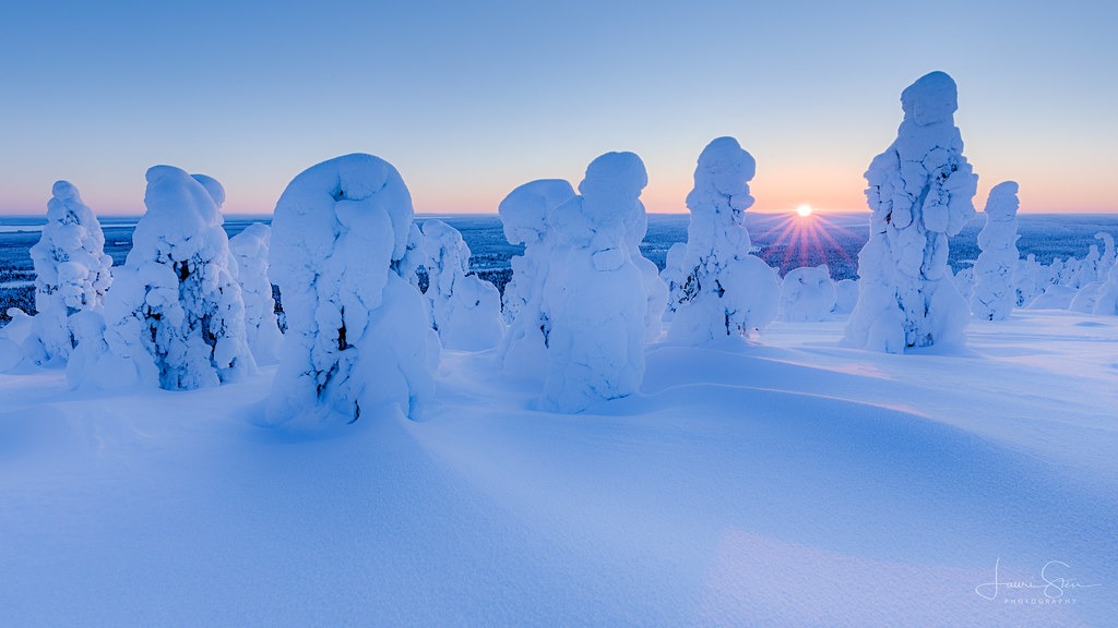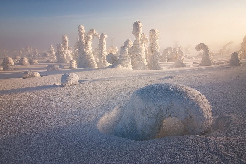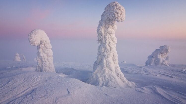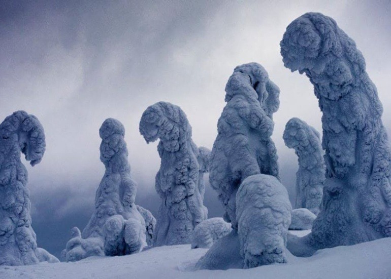 In Finland temperature gets as low as -40°C (-40°F) in winter, and in such weather trees get covered in so much snow and frost that it makes the landscape look as if it was from another planet.