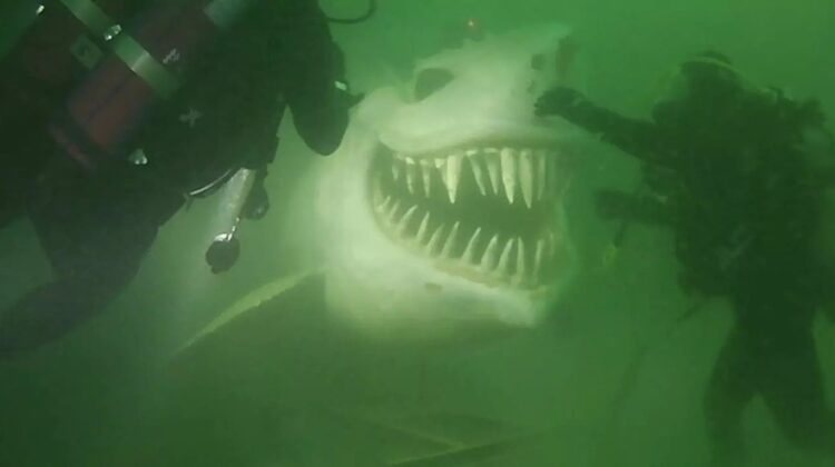 This isn’t a scene from a Disney movie, and the origins of the underwater beast remain shrouded in speculation. According to LADbible, the massive fiberglass shark is believed to be a leftover prop from a 1975 Swiss horror film that was never completed.