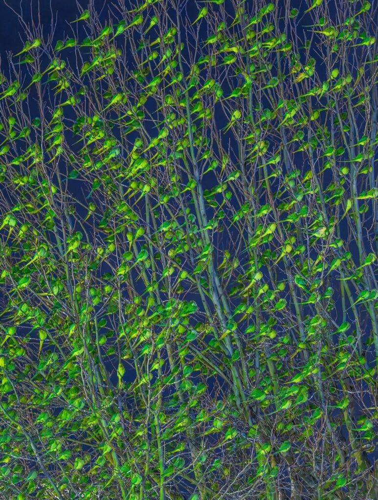 As the sun sets, the birds gather together in massive numbers, settling into the branches for the night. Their bright green feathers blend so closely that the individual birds become almost impossible to distinguish. From a distance, the tree appears to glow, ripple, and shift, creating the illusion that it is alive.
