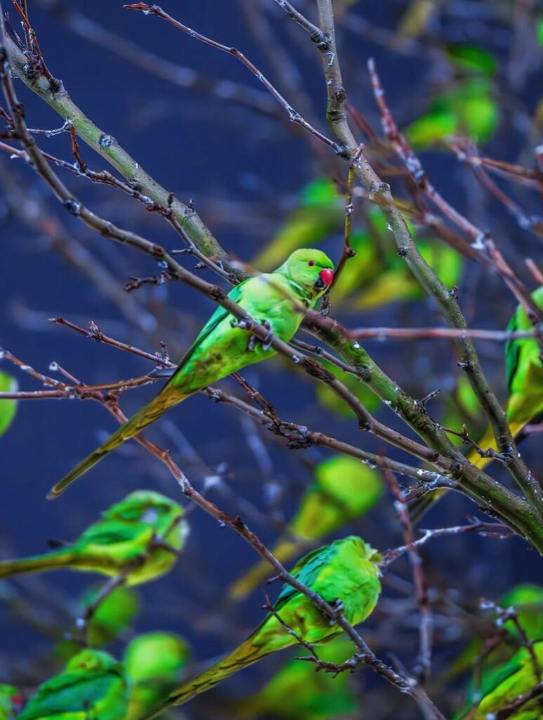 As evening approaches, parakeets arrive from all directions in loud, fast-moving flocks. Their high-pitched calls fill the air as they compete for space among the branches. Within minutes, entire trees become packed with birds, transforming ordinary city scenery into something almost surreal.