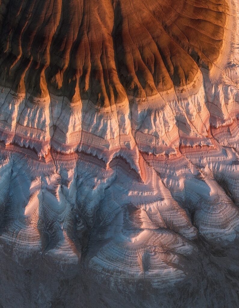 Located in the Mangystau region, Bokty is famous for its striking horizontal stripes. The bands of color — soft browns, pale creams, and muted reds — were formed over millions of years as sediment accumulated layer upon layer. Over time, pressure hardened those deposits into rock. Then wind, erosion, and extreme desert conditions sculpted the formation into the clean, symmetrical shape we see today.