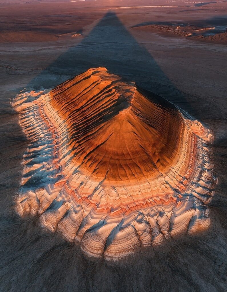 For photographers and geology enthusiasts, Bokty has become one of Mangystau’s most visually compelling landmarks. The mountain’s symmetry and layered structure create strong natural contrast, especially during sunrise and sunset when shifting light deepens its bands and casts long shadows across the terrain.
