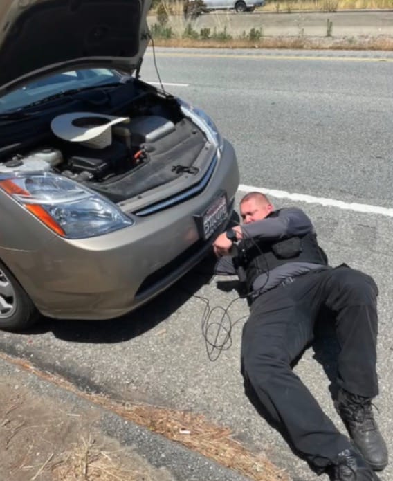 With the cat’s life in danger, Moore decided to stop traffic on the highway while he made the rescue. The officer tried to catch the kitten again, but she jumped into the wheel well of a Prius and crawled into the fuel tank.