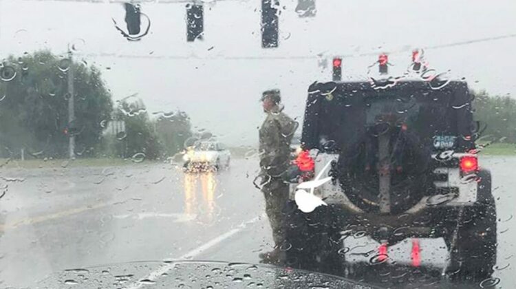 Hester wrote on her Facebook: “I was so completely touched by this today. A funeral procession was passing by and this soldier got out of his jeep to stand at attention in the pouring rain. I always get frustrated when I see cars that don’t pull to the side and stop for a procession, but this gentlemen went above and beyond.