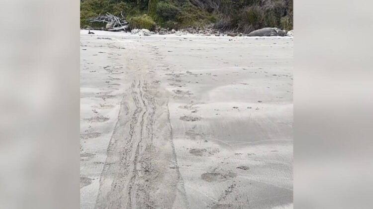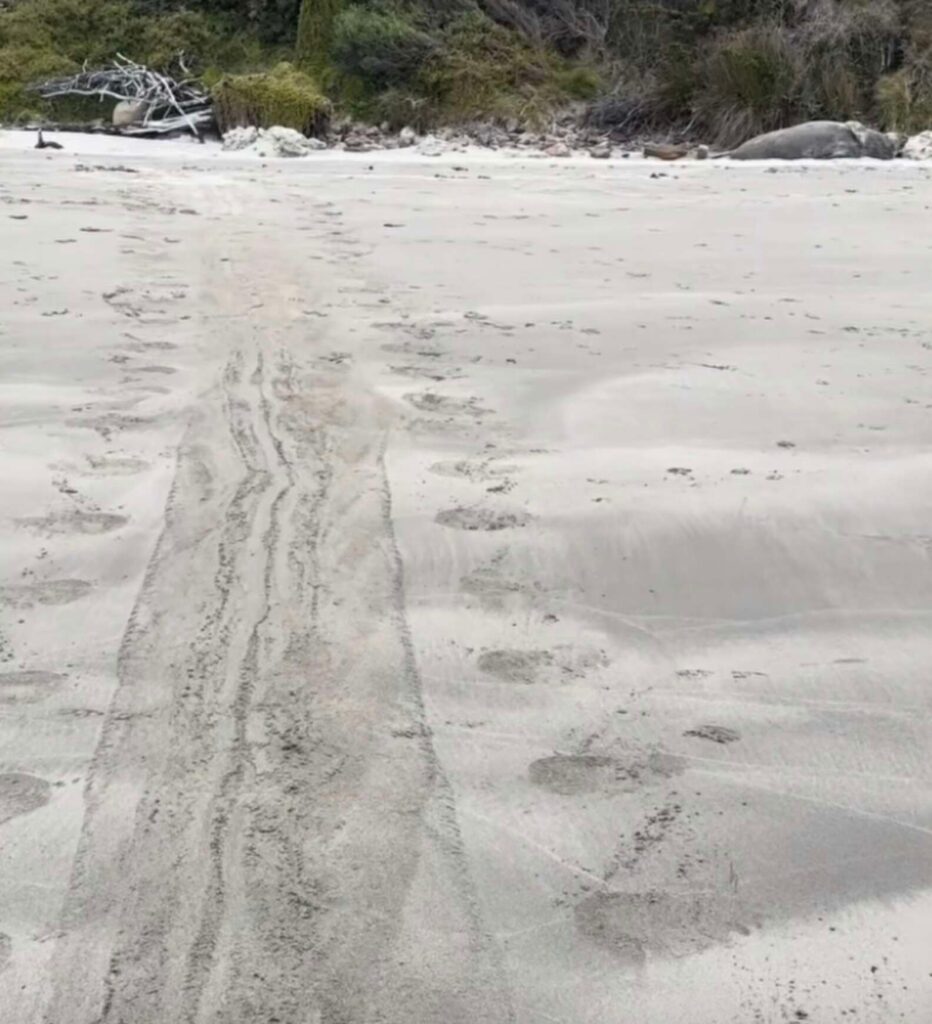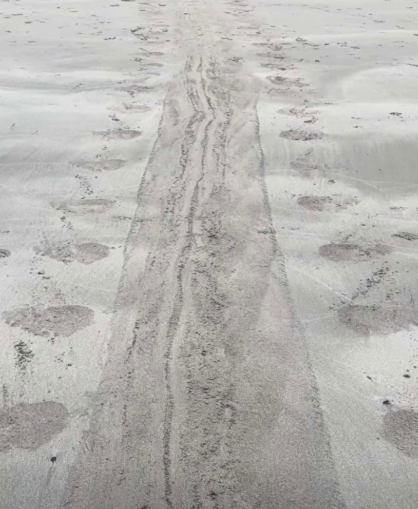Earlier this week, a massive marine animal emerged from the ocean and slowly made its way across the shoreline toward a shaded sand dune. As it moved, it left behind a wide, rectangular trail marked by small, rounded impressions on each side โ€” tracks unlike anything typically seen on the beach.