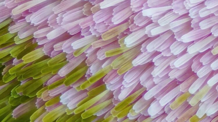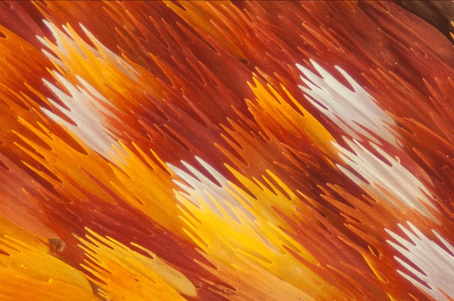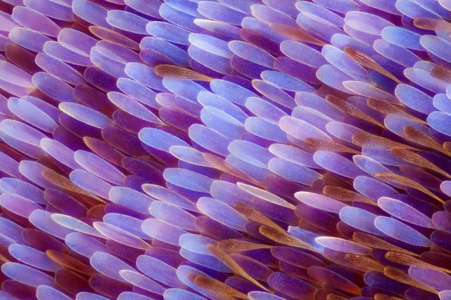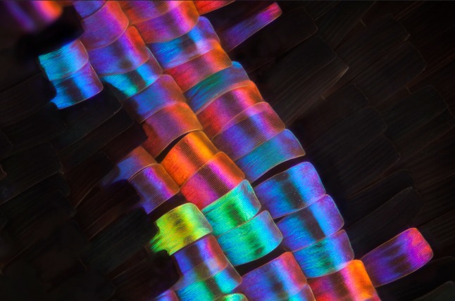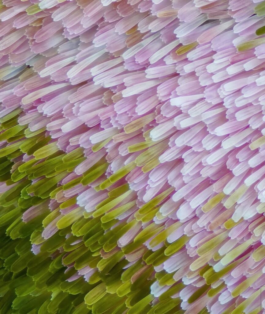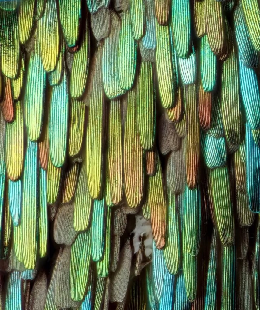 Using advanced macro photography techniques, Gledhill captured a hidden world invisible to the naked eye. What appears from a distance as a smooth, colorful surface is, in reality, a breathtaking landscape of thousands of microscopic scales layered like roof tiles. Each scale resembles a tiny petal or feather, overlapping with mathematical precision. The result is what many describe as a “wing-ception” effect — miniature wing-like structures forming the larger wing itself.