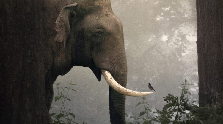 An elephant emerges from the morning mist, calm yet commanding. On its tusk perches a small black myna bird, their eyes locked in quiet conversation.
